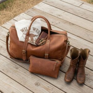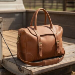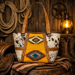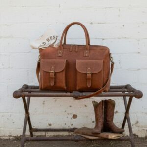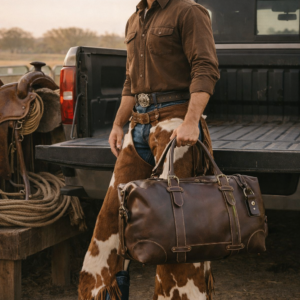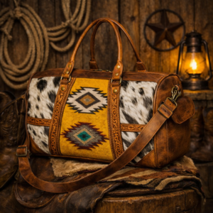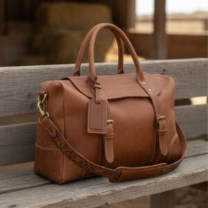 Sized at H 10″ × W 20″ × D 10″, it offers spacious interior storage, reinforced leather handles, and a padded adjustable shoulder strap. Whether tossed in the truck bed, looped over a saddle horn, or carried through the airport, this bag turns heads and holds its ground.