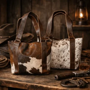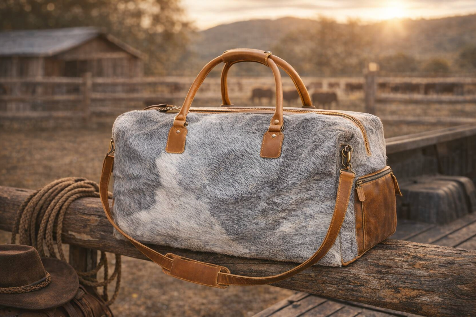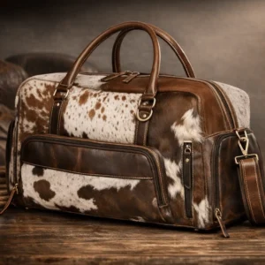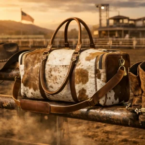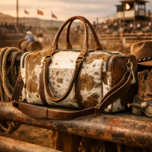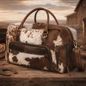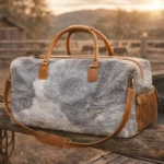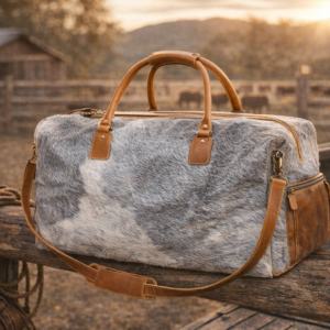 Introducing The Silverpoint Range — a premium cowhide duffle bag from Rustic Western Co., engineered for those who live with grit, travel with purpose, and demand elite craftsmanship. Built from gray and white authentic cowhide and reinforced with full-grain tan leather, this bag blends rugged Western durability with luxury-grade refinement.
