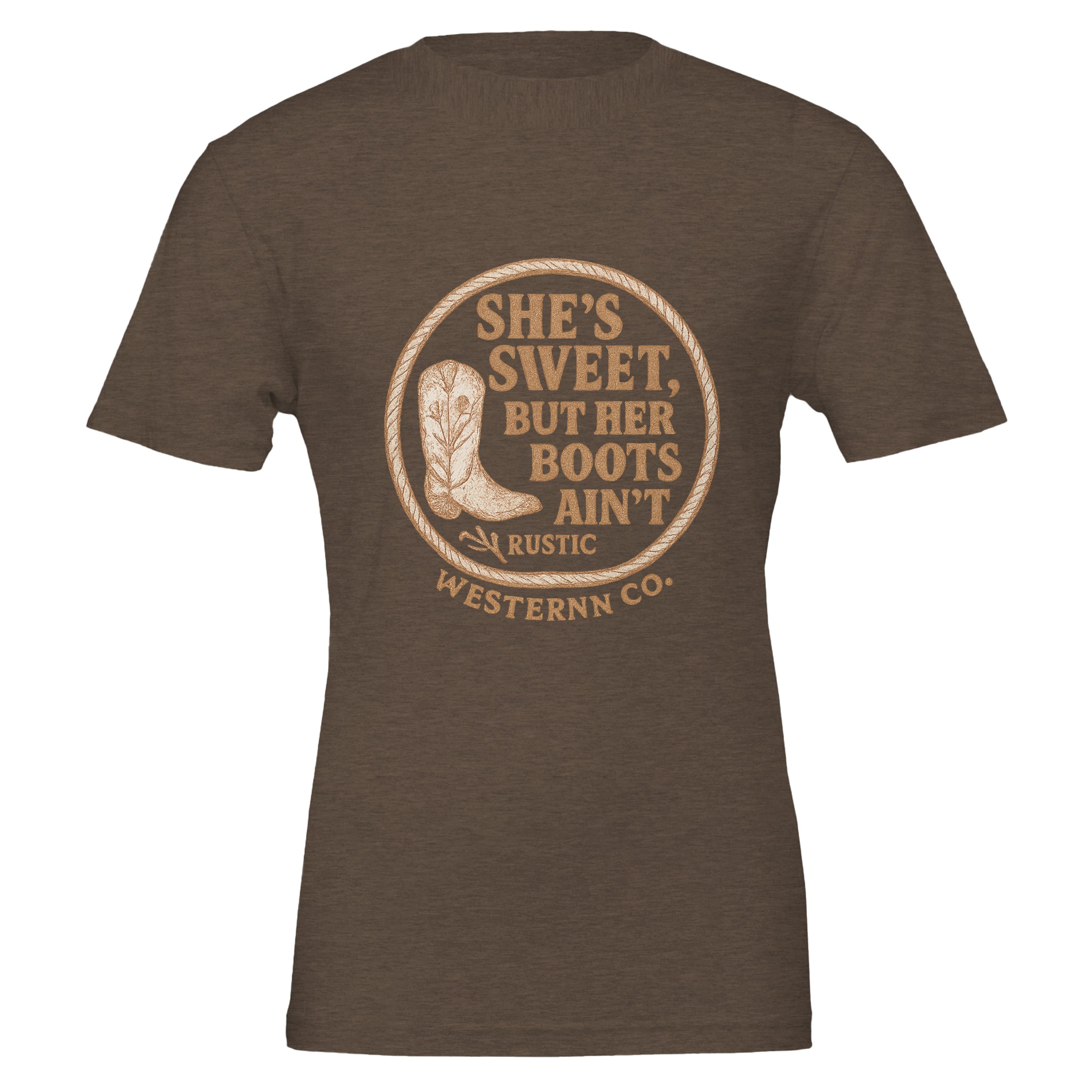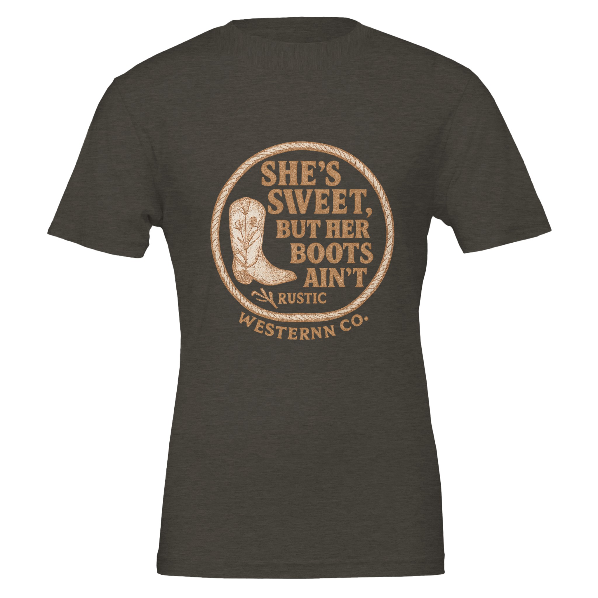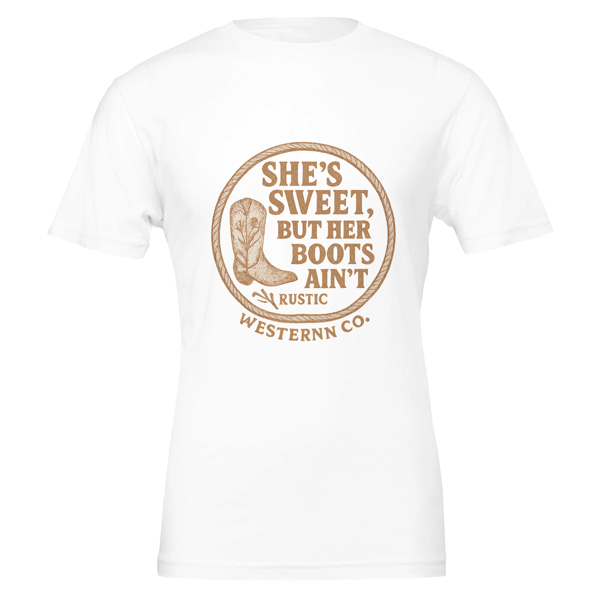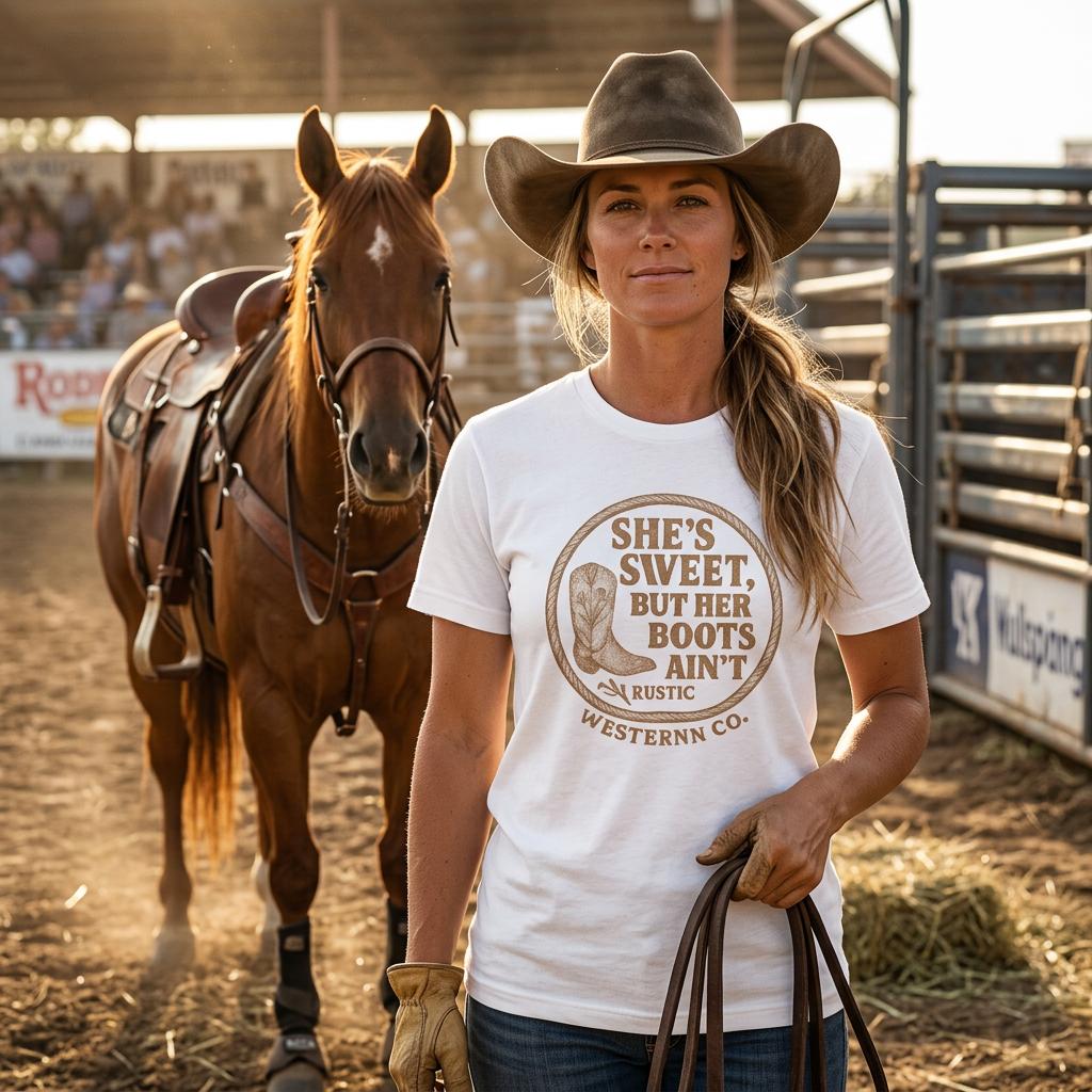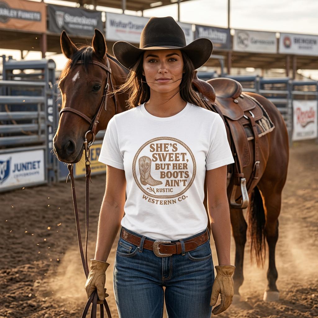 She’s Sweet But Her Boots Ain’t Western Cowgirl Shirt Women’s Rustic Western Graphic Tee Country Rodeo Outfit Top Boho Cowgirl Attitude Apparel by Rustic Western Co.